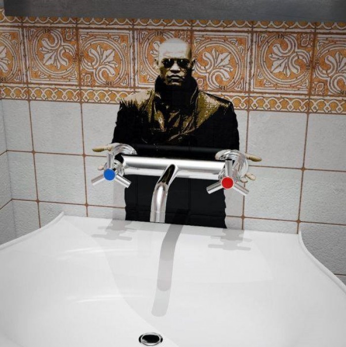 Morpheus holding faucet and asking you to choose between red or blue tap.