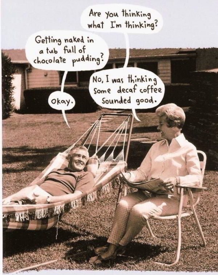 Are you thinking what I'm Thinking? Getting naked in a tub full of chocolate pudding? No, I was thinking some decaf coffee sounded good. Okay.