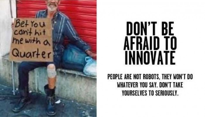 Bet you can't hit me with a quarter. Don't be afraid to innovate. people are not robots, they won't do whatever you say. Don't take yourselves to seriously. This poor man is innovative :)