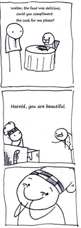 Waiter, the food was delicious, could you compliment the cook for me please? Harold, you are beautiful.