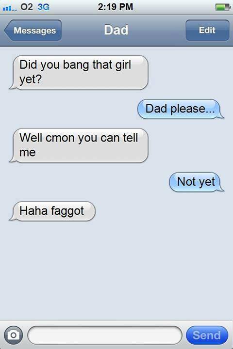 Dad asks son - Did you bang that girl yet ? ; Dad please ; Well come on you can tell me ; Not yet ; Haha faggot !