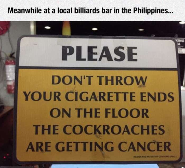 Meanwhile at a local billiards bar in the Philippines... Don't throw your cigarette end on the floor. The Cockroaches are getting cancer. That’s A Very Considerate Sign.