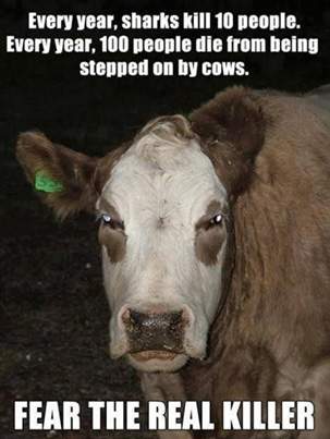 Every year, sharks kill 10 people. Every year, 100 people die from being stepped on by cows. Fear the real killer.