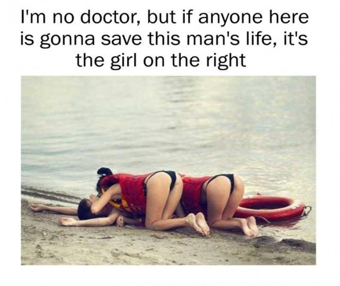 I'm no doctor, but id anyone here is gonna save this man's life, it's the girl on the right.