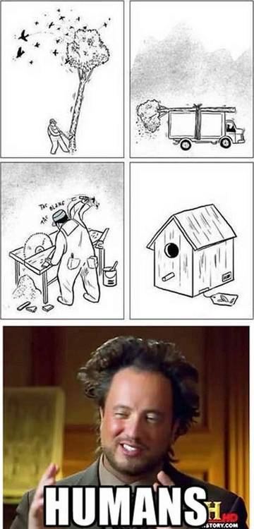 Humans you must love them. Cut down the tree destroying natural house for birds to create wooden bird house. Irony !