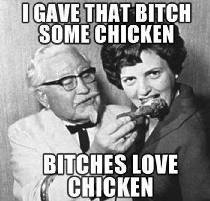 I gave that bitch some chicken... bitches love chicken :) Colonel Harland David Sanders (September 9, 1890 – December 16, 1980) was an American businessman, best known for founding Kentucky Fried Chicken (KFC)