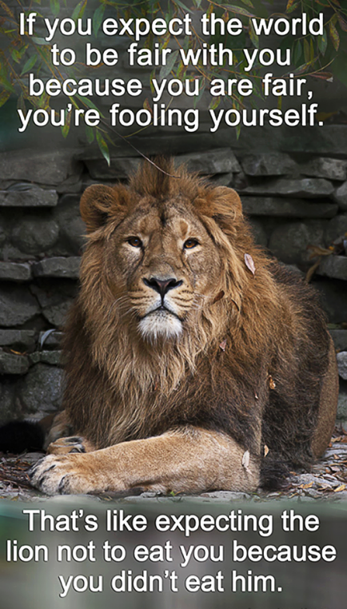 "If you expect the World to be fair with you because you are fair, you're fooling yourself. That's like expecting the lion not to eat you because you didn't eat him." But still... miracles are happening all the time ;)
