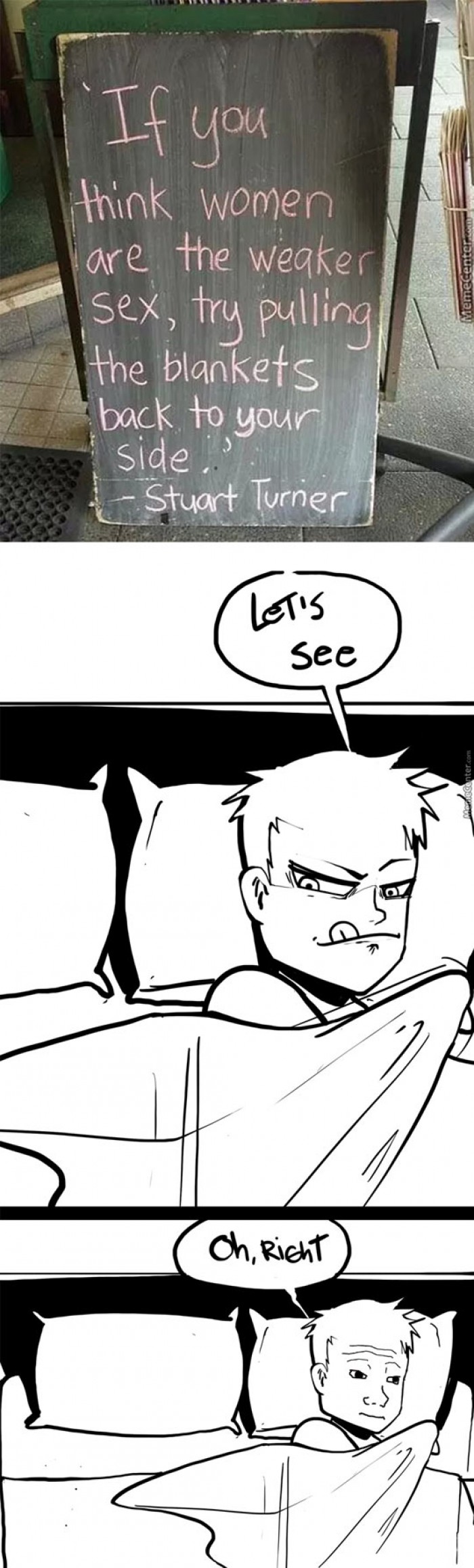 If you think women are the weaker sex, try pulling the blankets back to your side. Stuart Turner Quote