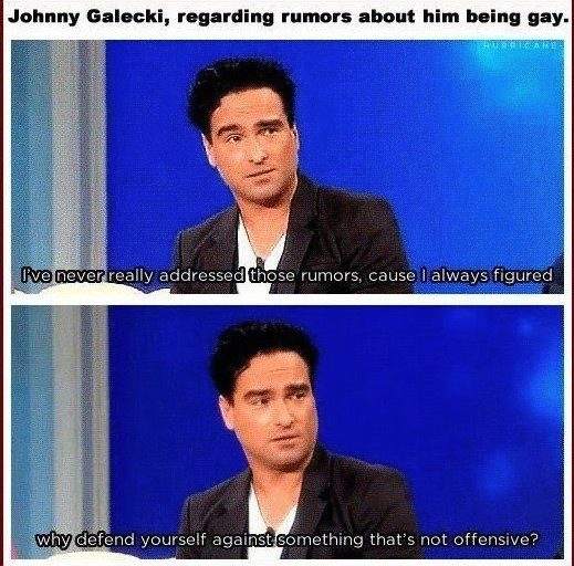 Johnny Galecki ( Leonard Hofstadter - The Big Bang Theory), regarding rumors about him being gay; I've never really addressed those rumors, cause I always figured why defend yourself against something that's not offensive?