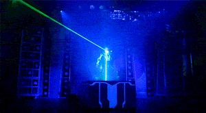 Amazing laser show. Looks like he has a powerful laser weapons in his hands.