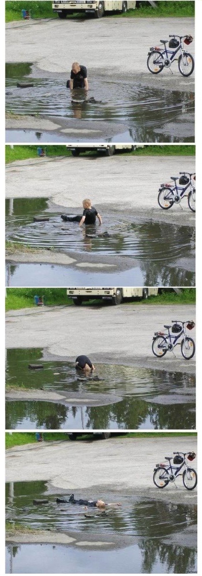 The boy saw a puddle of water, he stopped and took a bath in it.