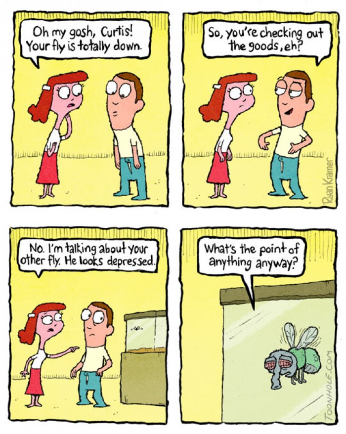 Oh my gosh, Curtis! Your fly is totally down. So, you're checking out the goods, eh? No. I'm talking about your other fly. He looks depressed. What's the point of anything anyway?