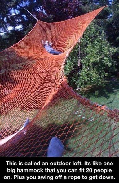 This is called an outdoor loft. Its like one big hammock that you can fit 20 people on. Plus you swing off a rope to get down.