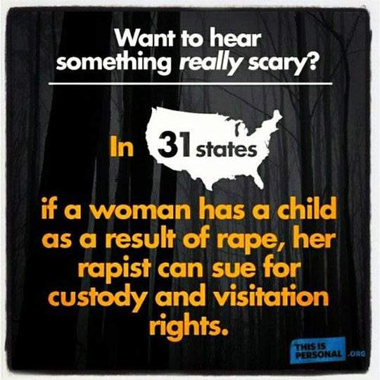 In 31 states if a woman has a child as a result of rape, her rapist can sue for custody and visitation rights. http://thisispersonal.org