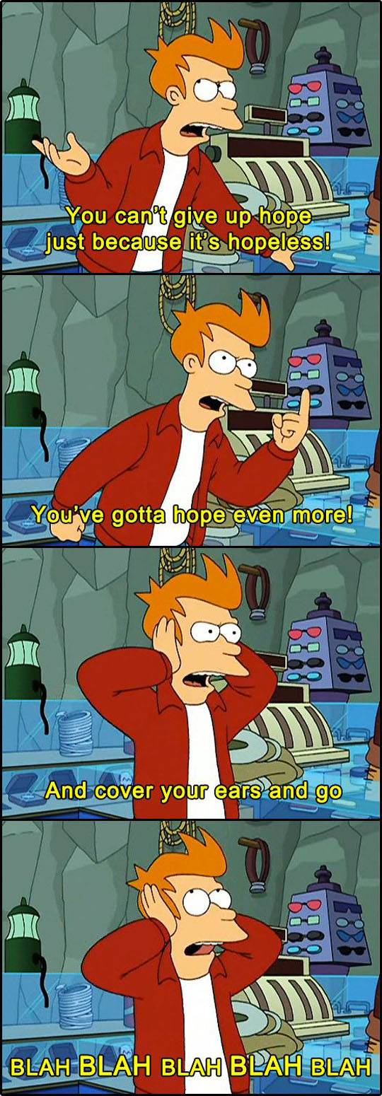 You can't give up hope just because it's hopeless! You've gotta hope even more! And cover your ears and go; BLAH BLAH BLAH BLAH BLAH BLAH ! From Futurama
